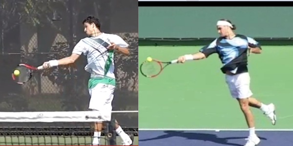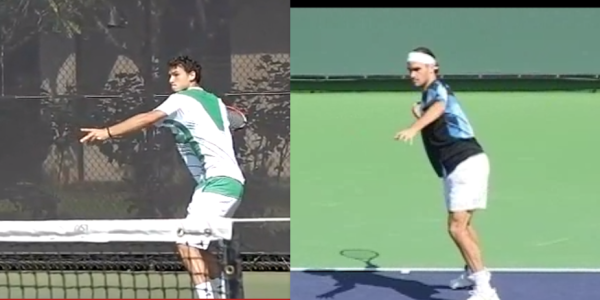 Both players begin their take-back on the forehand by turning their shoulders and raising both hands together. The left hand is on the throat of the racket, the racket face beginning to rotate outwards. One of the key aspects of this movement is that by raising and twisting both arms outwards together, it helps to initiate the hip and shoulder turn. Taking the right hand by itself doesn’t constrain the shoulders to turn in order to accommodate the second hand. Also worth noting here is the way that the racket heads of both players lean towards to the net slightly rather than being vertical.